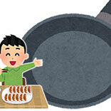 焼けた餃子を皿に移そうとして大失敗。餃子のならんだ大きなフライパンに同サイズの皿をかぶせ、右手でフライパンの柄、左手は皿のお尻。これを一緒に上に浮かしタイミングよくひっくりかえす。で、焼き目が上になって綺麗に盛り付け。