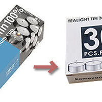 そのカメヤマのティーライトティン キャンドル。いろいろ試行錯誤。最初は緑箱のマレーソア産「パームワックス100%」というのを買っていましたが、そのうち植物100%だから高級というものでもないらしい・・・と知り、今度は国産をうたっている青箱にしました。青箱はたぶんパラフィン100。芯が少し細いです。