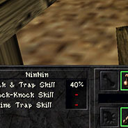 修道院の玄関先でお決まりのStealth修行。戦士系が45、他が50くらいまで修行したところで、飽き飽きした相手の小ガニが遁走してしまいました。あえて探しにいってもいいんですが、ま、これでよしとしますか。それから二階に上がって、こんどは橋の向こうの宝箱相手にイジイジとInspect修行。NinjaはなんとかLockスキル40に達しました。もういいかな。